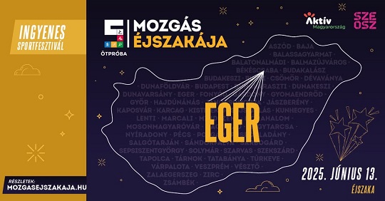 SZABADIDŐSPORT - A Közigazgatási és Területfejlesztési Minisztérium aktív Magyarországért felelős államtitkára) a Szabadidősport-eseményszervezők Országos Szövetsége ( SZEOSZ) bevonásával 2025. június 13-án rendezi meg a 2025. évi Mozgás Éjszakája Programot. A szervezők célja célja, hogy az éjszakai sportfesztiválob országszerte egyidőben sokezren sportoljanak. z esemény időtartamának legalább 6 órának kell lennie. az egészséges és aktív életvitelt szükséges népszerűsítenie, lehetőség szerint helyi sportszervezetek bevonásával. A kötelező sportágak (természetjárás, nordic walking, futás (legalább két táv 3 ill. 7. km)kerékpározás (10 km) és aerobic, fitness, tánc megrendezése mellett z egészséges és aktív életvitelt szükséges népszerűsítenie, lehetőség szerint helyi sportszervezetek bevonásával. Eger Megyei Jogú Város önkormányzata elsődleges koordinátorként csatlakozott az országos eseményhez. A harminc sportszervezet bevonásával 2000 egri ember regisztrált sportoltatása a cél.Bővebben itt...