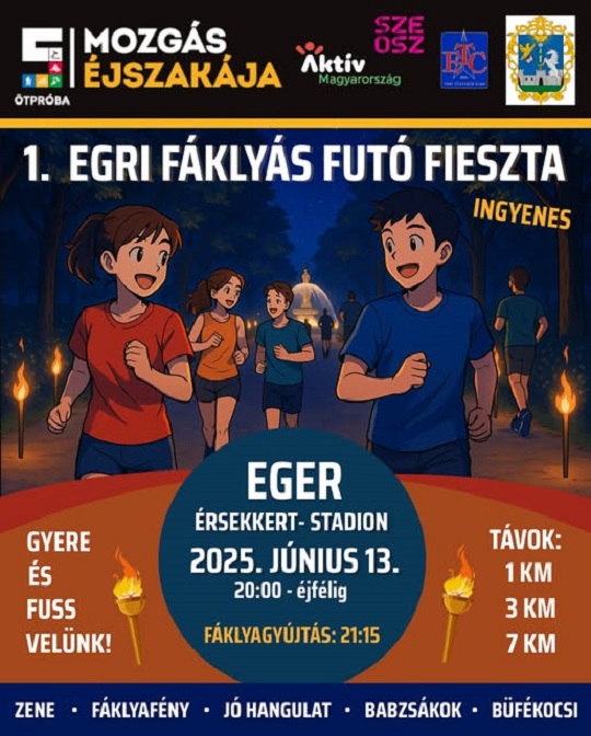 | Bőséges sportkínálat várja az egrieket a Mozgás éjszakáján | 2025-06-12 08:07:58 SZABADIDŐSPORT - Idén először Eger is bekapcsolódott az Aktív Magyarország program támogatásával megvalósuló Mozgás Éjszakája nevei viselő prszágos rendezvényre, amelynek két fő helyszíneként az Érsekkert valamint a Kemény Ferenc Sportcsarnok szolgál. Az eseményre 30 helyi sportszervezet fogadta el az egri városvezetés meghívását, hogy ízelítőt adjon a saját sportágából. A szervezők egy különleges hangulatú éjszakában igyekeznek sportélményt nyújtani. Az esemény sajtótájékoztatóján az érsekkerti szabadtéri kondiparkban Vágner Ákos, Eger polgármestere életkortól függetlenül sportolásra biztatta az egrieket június 13-án pénteken este. Harminc egri sportszervezet kínál programokat éjjel 2-ig. Célunk, hogy tapasztalják meg közös mozgás örömét élményét. - A programok 18.30 órakor kezdődnek, a hivatalos megnyitót mazsorett és cheerleaders-showal fűszerezve 20.45 órakor tartjuk az érsekkerti szökőkútnál – fogalmazott Vágner Ákos. – A rendezvény egyik főeseményét a fáklyás futófieszta jelenti, ami közös bemelegítést követően 21.30-kor indul. A fáklyákkal és mécsesekkel megvilágított útvonal különleges hangulatot kölcsönöz a futáshoz. Nemcsak sportlélménynek, hanem közösségi élménynek is szánjuk az eseményt, amelyre minden korosztályt várunk. A rendezvény célja, hogy minél több embert ösztönözzünk a sportra, az atkív életmódra.